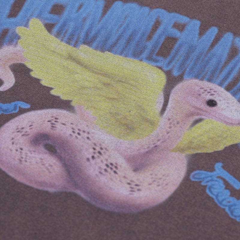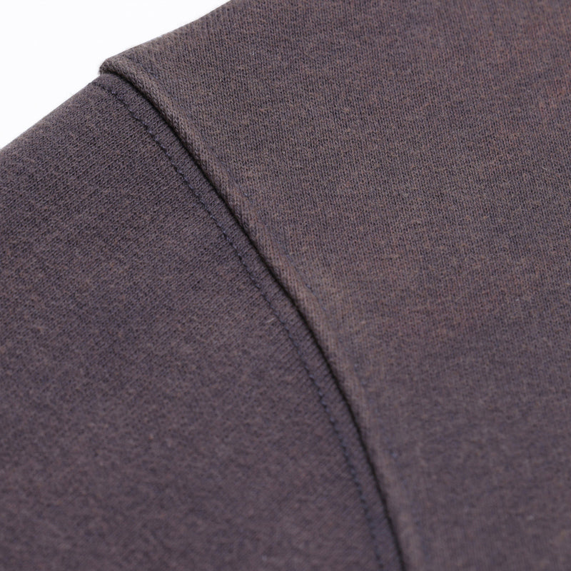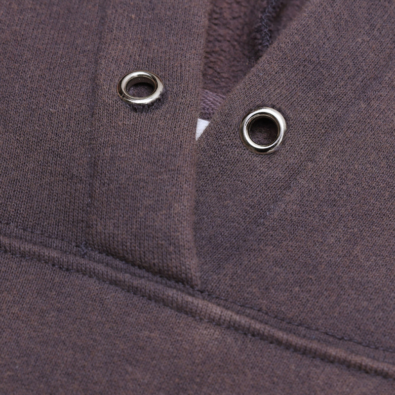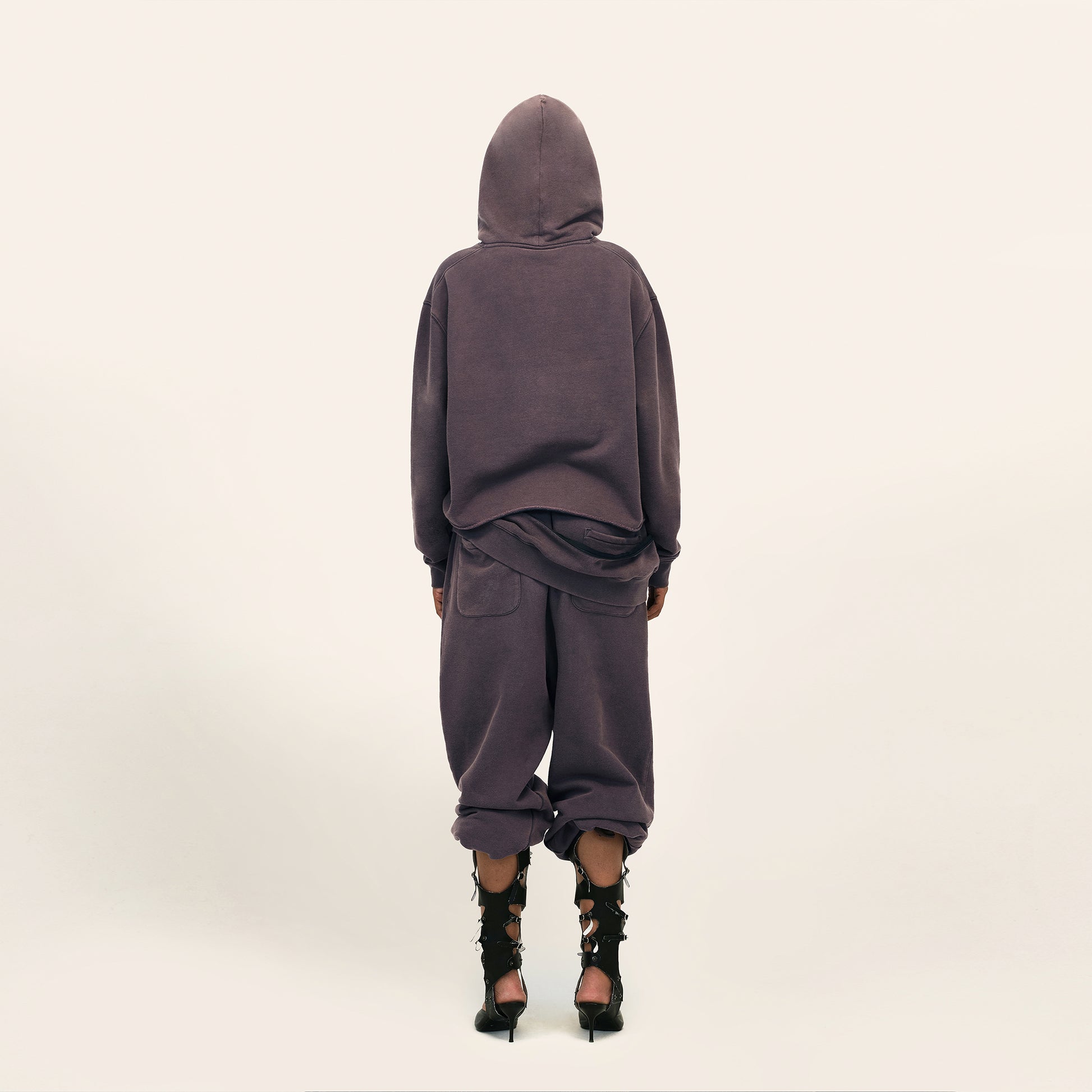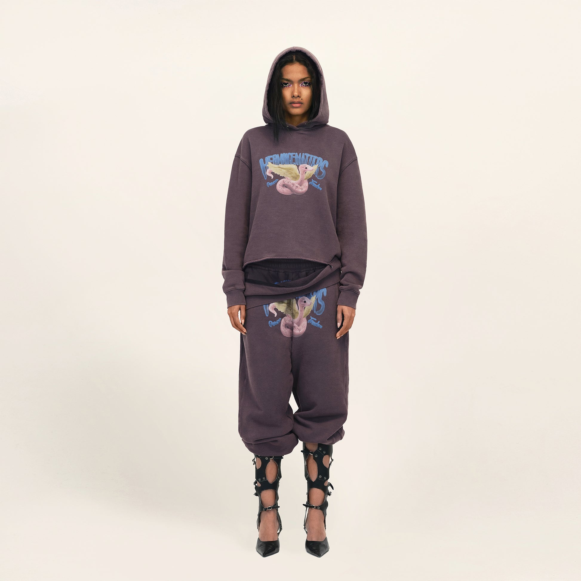 The purple-brown base is treated with a washing process to create a naturally distressed look, cleverly aligning with the season’s “TRAILBLAZER” theme. The front is adorned with the slogan “HER VOICE MATTERS,” expressed through a snake pattern and street graffiti style, precisely rendered using digital printing technology. This design conveys the empowering message of women expressing themselves and confronting their inner strength. The waist features a detachable hidden zipper, allowing for three different styling options: fully removed for a cropped raw-edge hoodie, half-zipped for a casual unfinished look, or zipped up for a classic oversized fit.