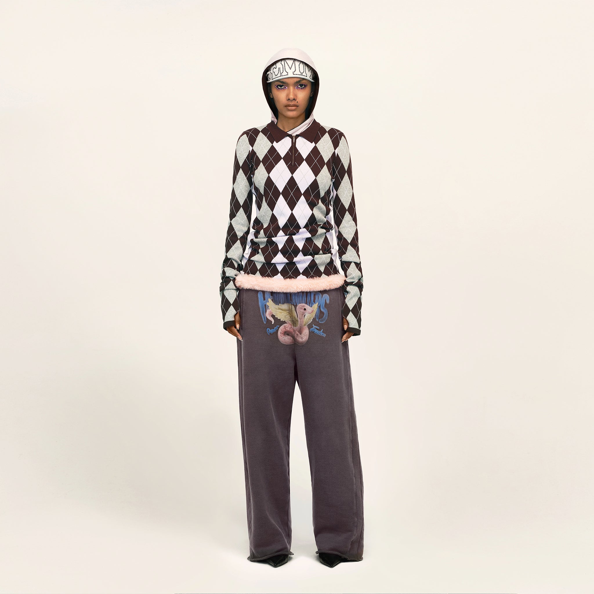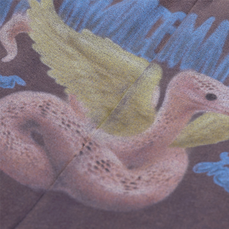 This piece is crafted from brushed cotton fleece fabric, offering a close yet soft and smooth touch. The purple-brown base is treated with a washing process, resulting in a naturally worn-in, distressed effect that imparts a distinct streetwear vibe. The bold “HER VOICE MATTERS” slogan print on the fly, accompanied by graffiti-inspired snake pattern detailing, is meticulously rendered using digital printing technology. After washing, the fabric gains a natural texture, conveying the strength of women expressing themselves and confronting their inner power, aligning with the “TRAILBLAZER” theme of the season.
