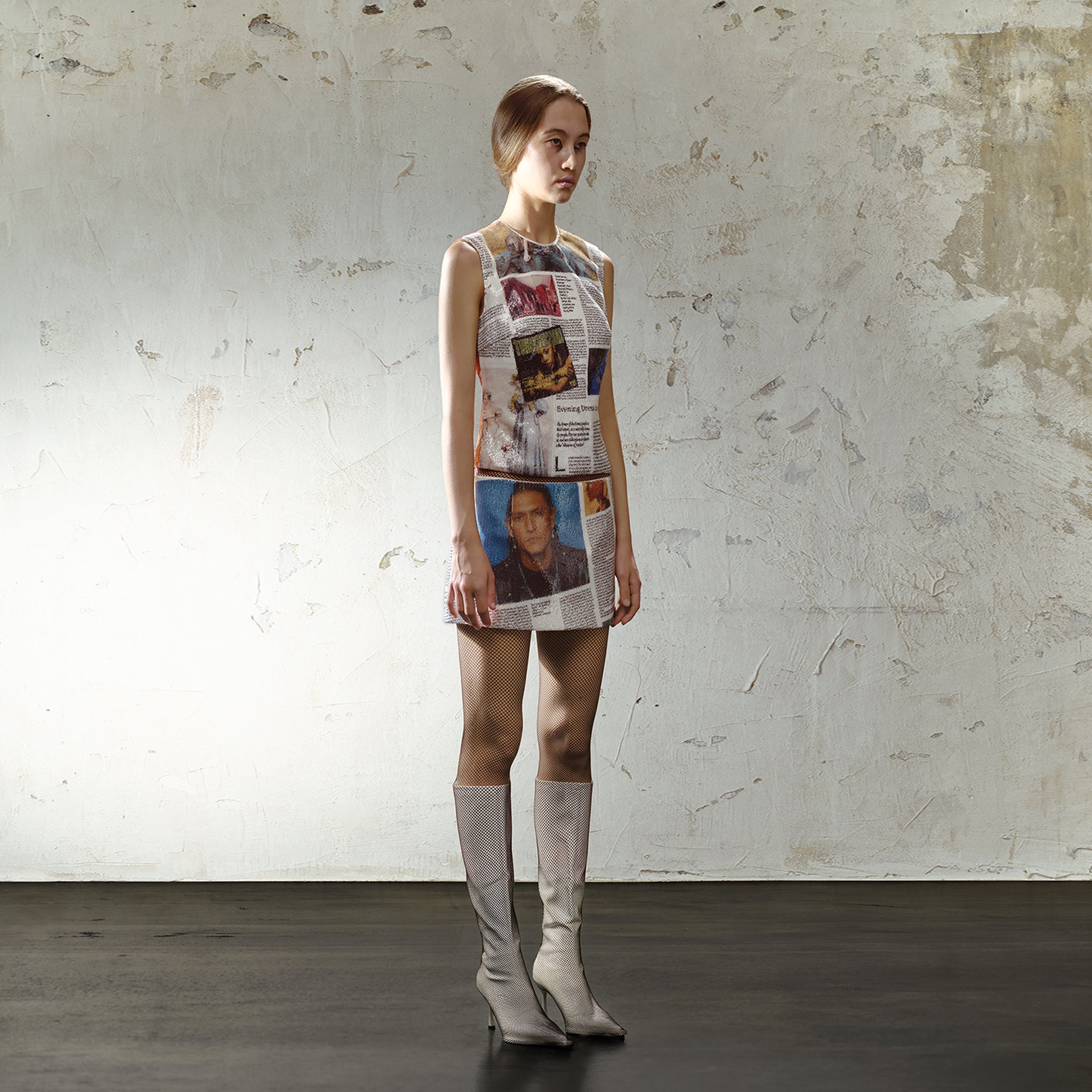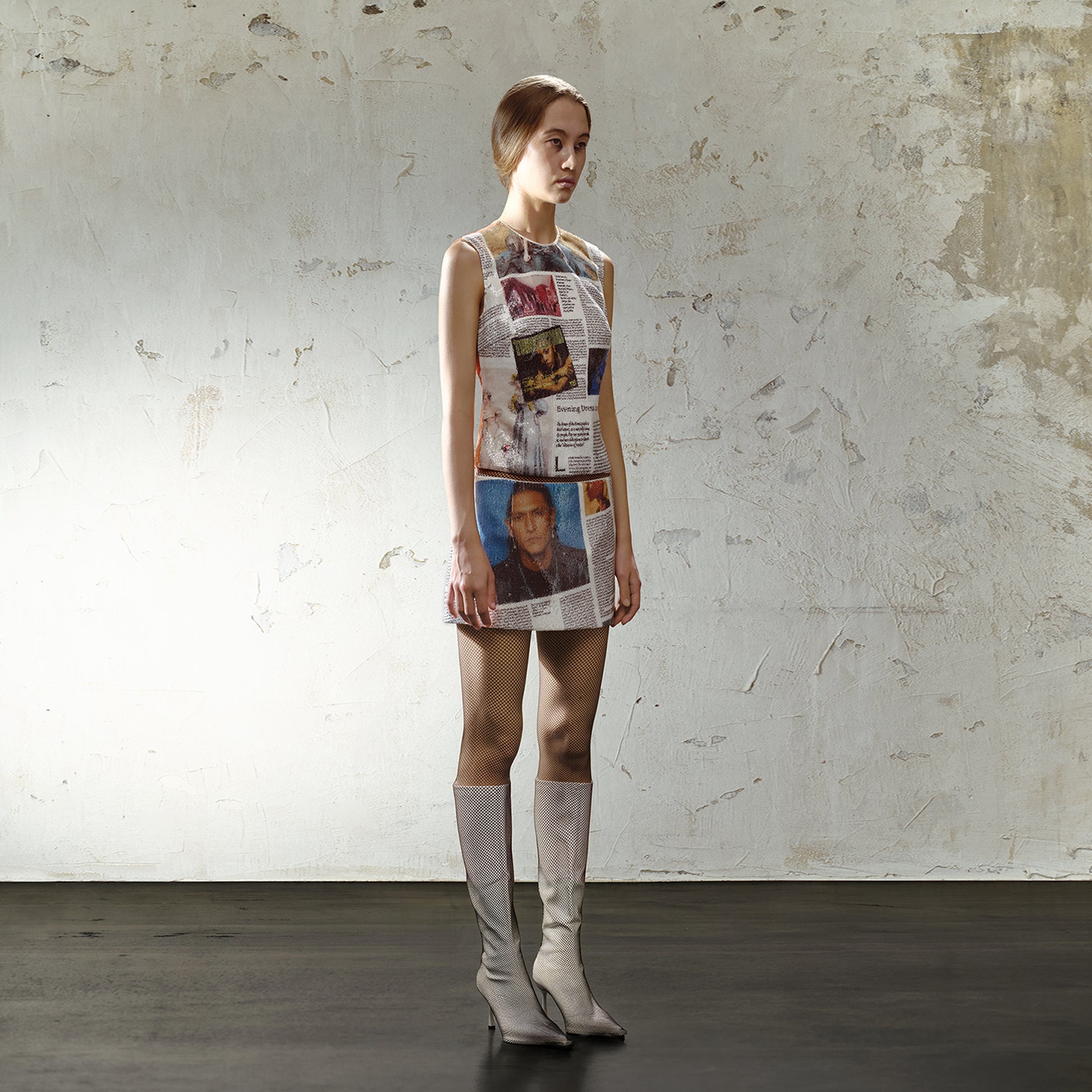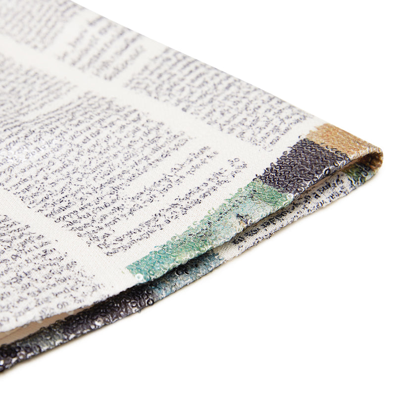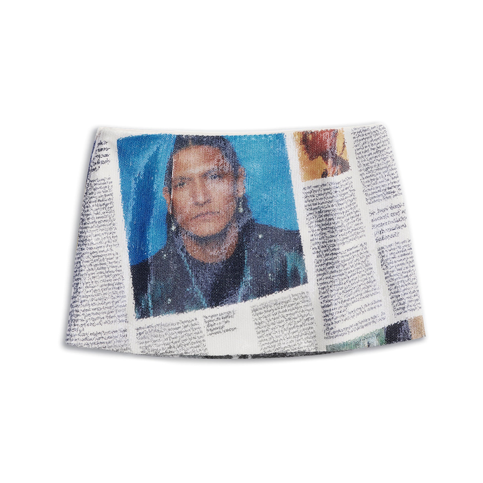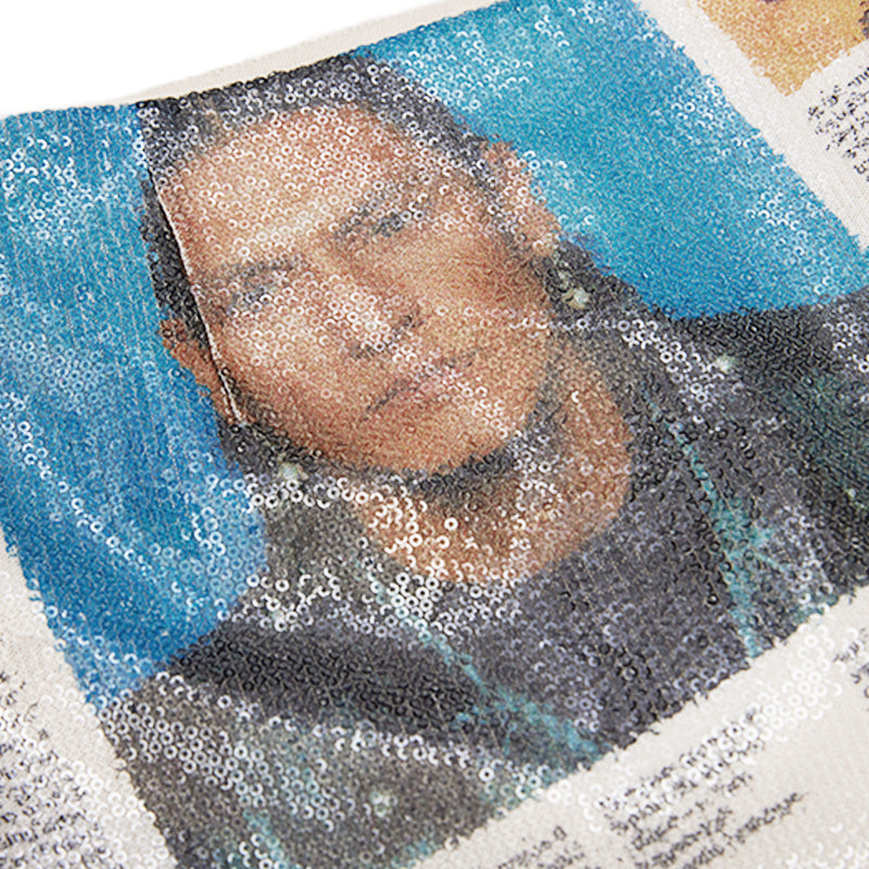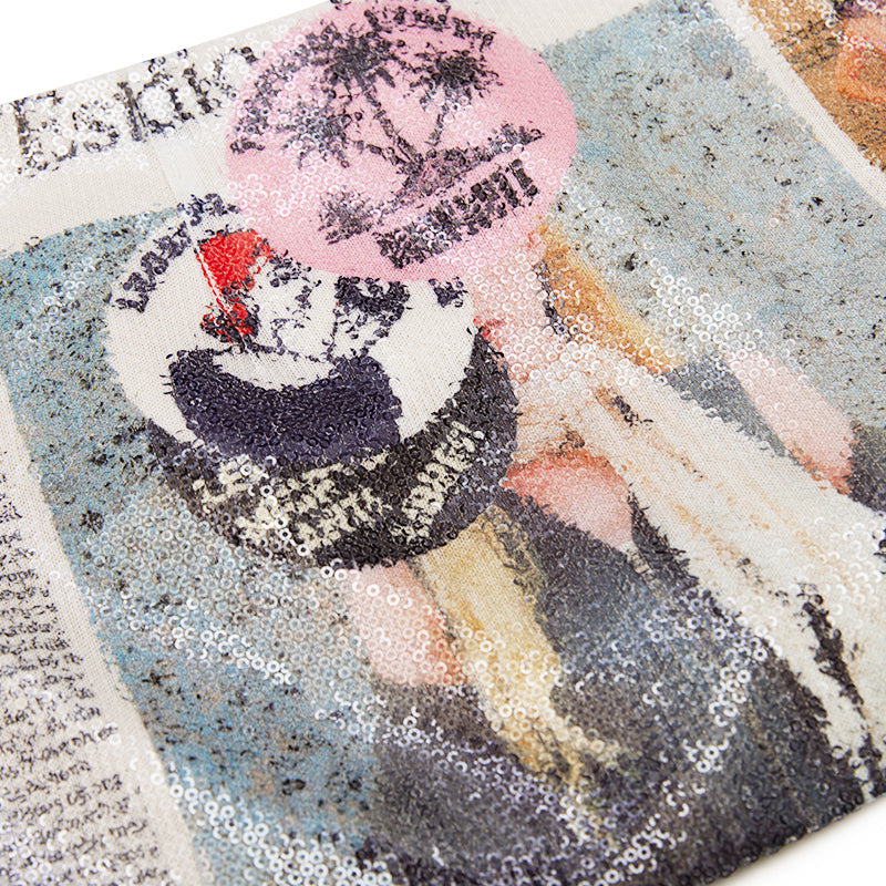 • Newspaper collage print on sequin material — light-reflective and layered