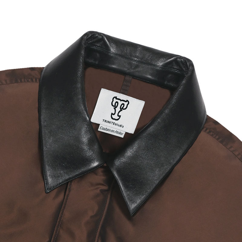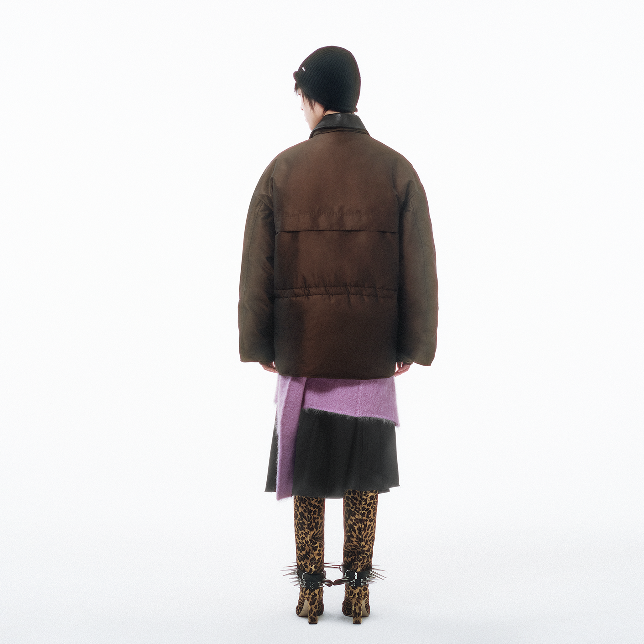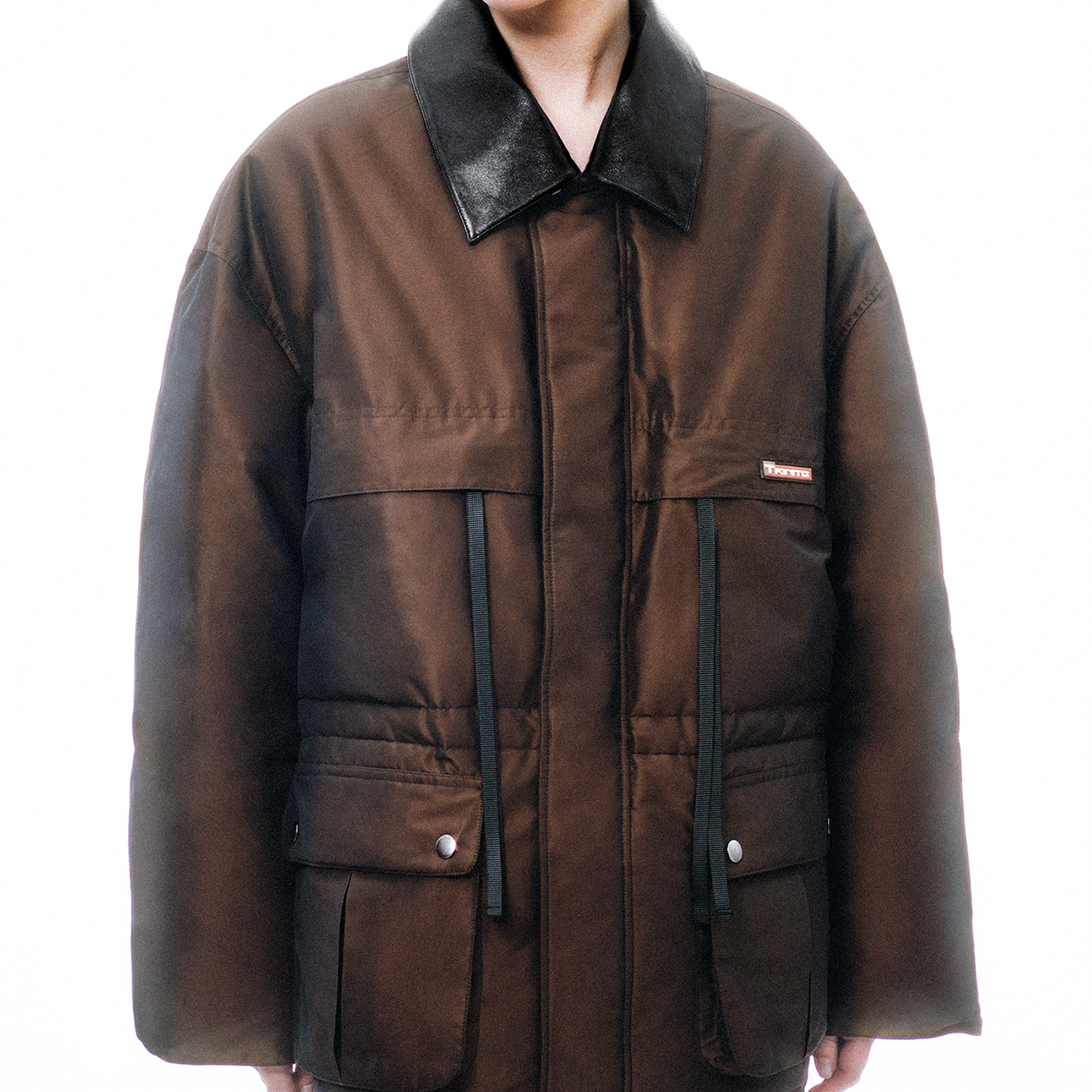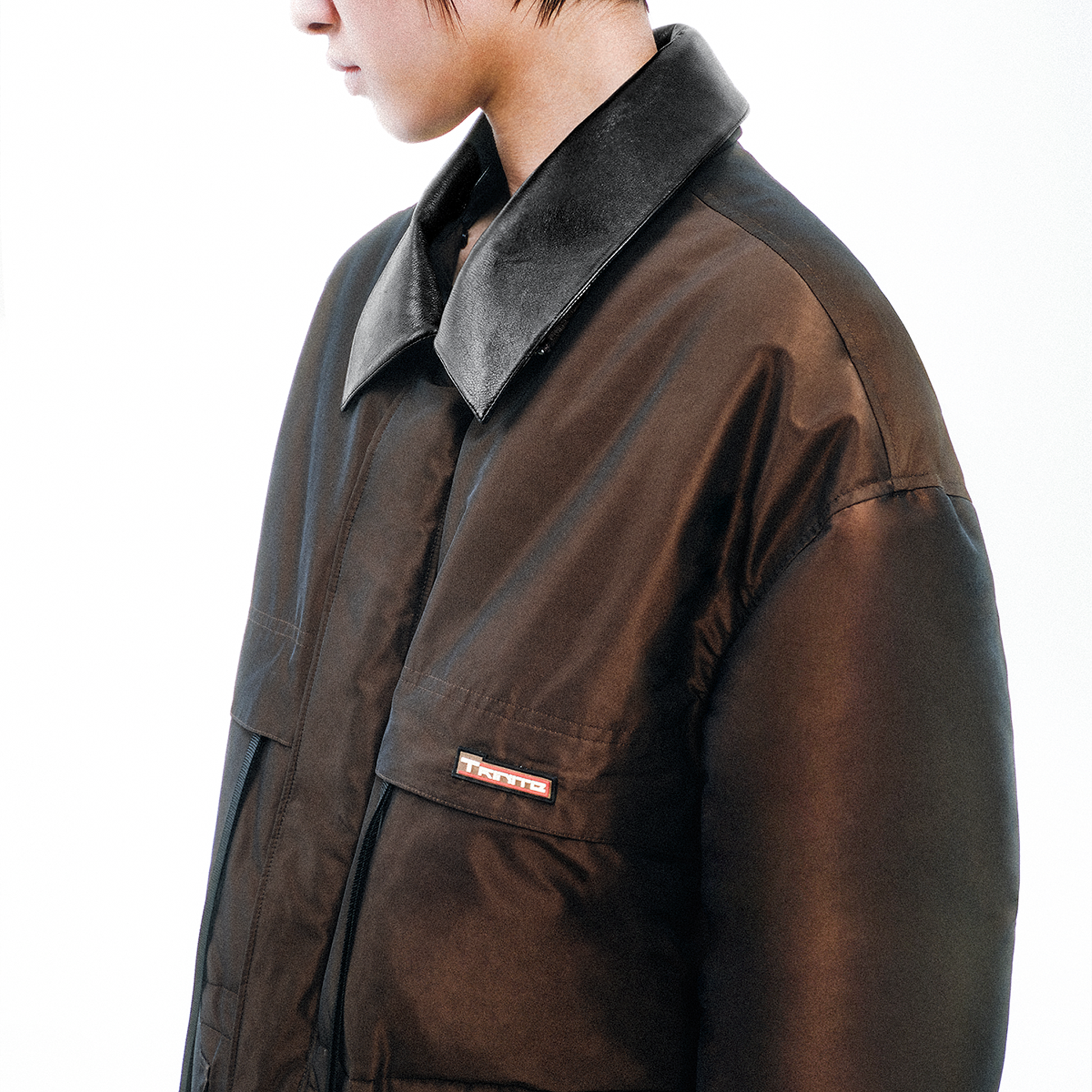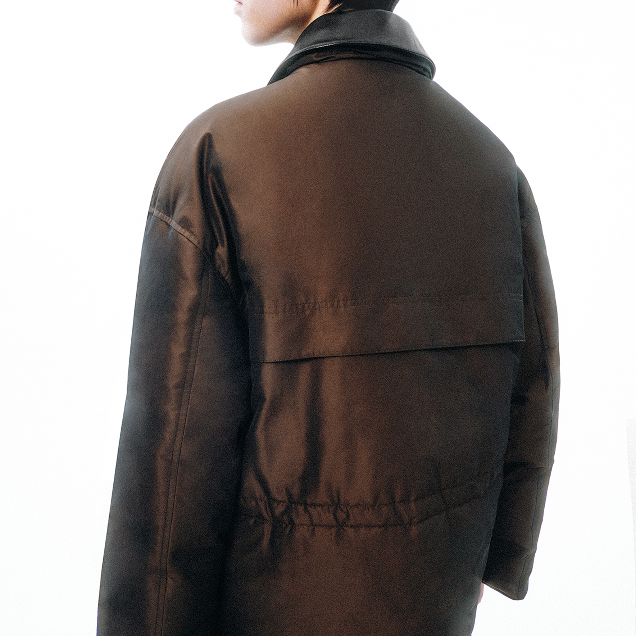 This down jacket seamlessly blends functionality and aesthetic detailing, featuring a detachable genuine leather collar for versatile styling across various occasions. Its overall design is anchored in a workwear-inspired multi-pocket layout, exuding a structured, rugged appeal. The fabric is crafted from a dual-tone silk-blend sourced from Como, Italy, offering the gentle luster and smooth texture characteristic of silk. Filled with 95% goose down (XS: 125g / S: 135g / M: 140g), it provides lightweight warmth, plush loft, and lasting comfort—making it an ideal choice for winter that balances practicality and style.