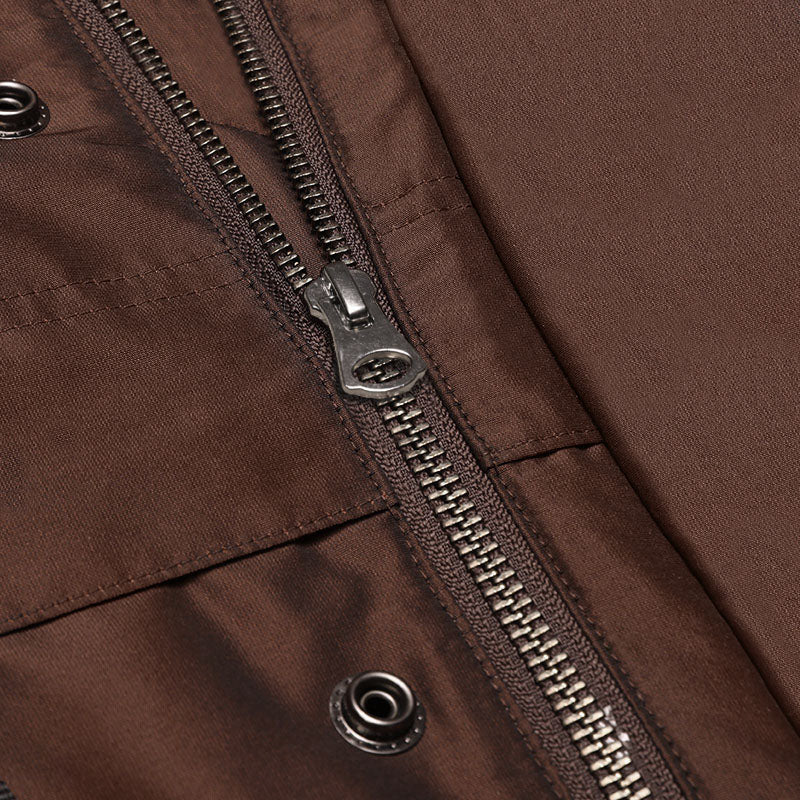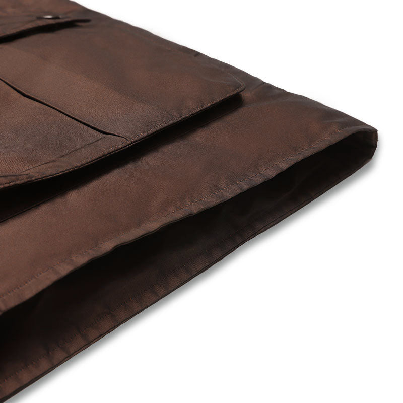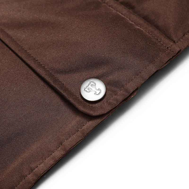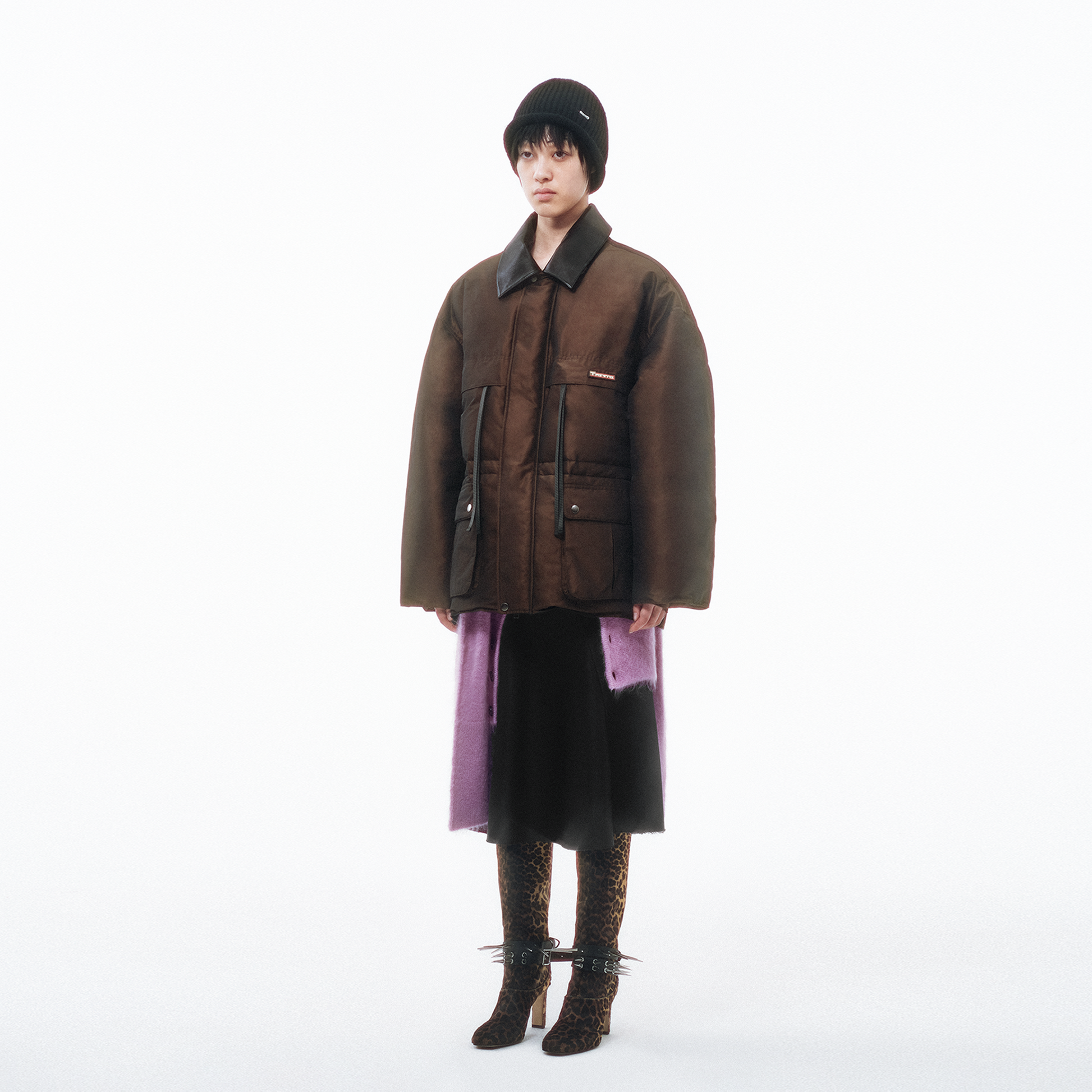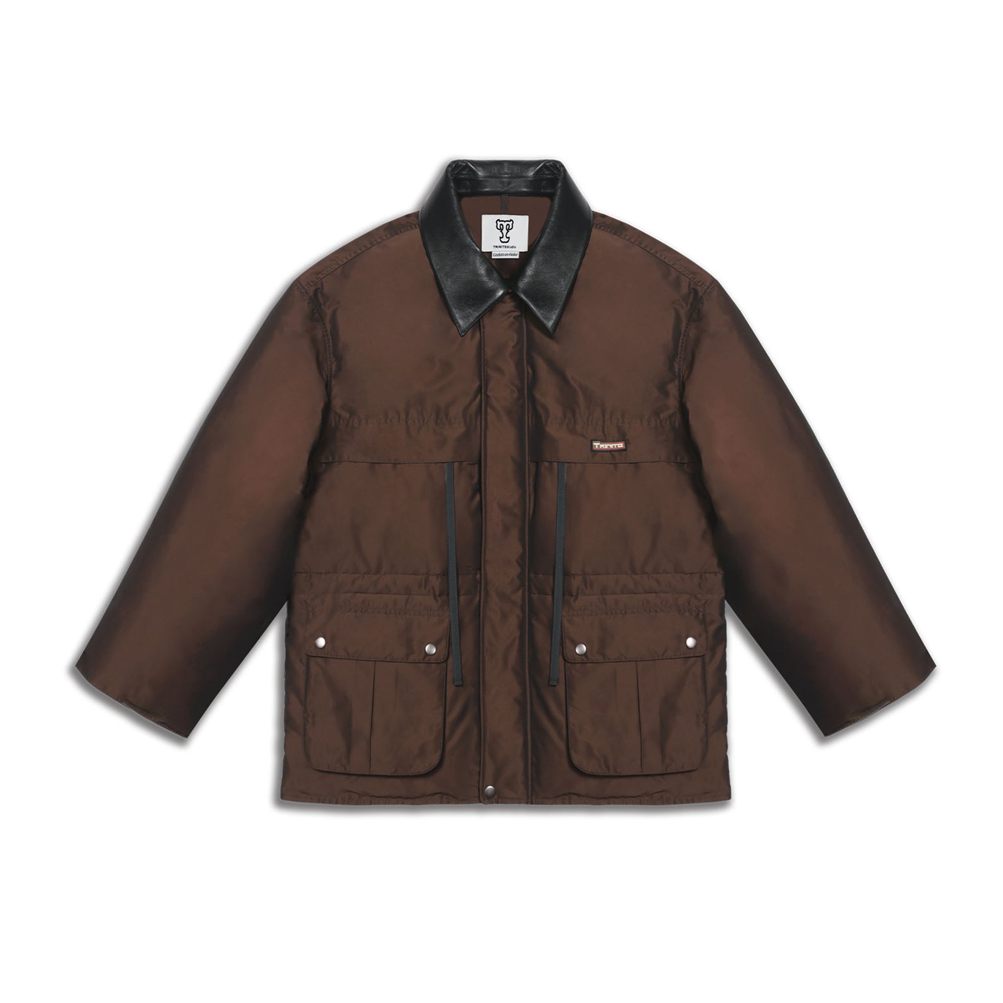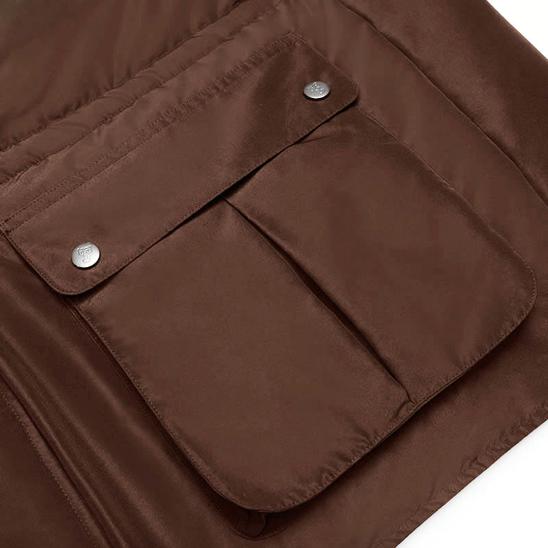 This down jacket seamlessly blends functionality and aesthetic detailing, featuring a detachable genuine leather collar for versatile styling across various occasions. Its overall design is anchored in a workwear-inspired multi-pocket layout, exuding a structured, rugged appeal. The fabric is crafted from a dual-tone silk-blend sourced from Como, Italy, offering the gentle luster and smooth texture characteristic of silk. Filled with 95% goose down (XS: 125g / S: 135g / M: 140g), it provides lightweight warmth, plush loft, and lasting comfort—making it an ideal choice for winter that balances practicality and style.