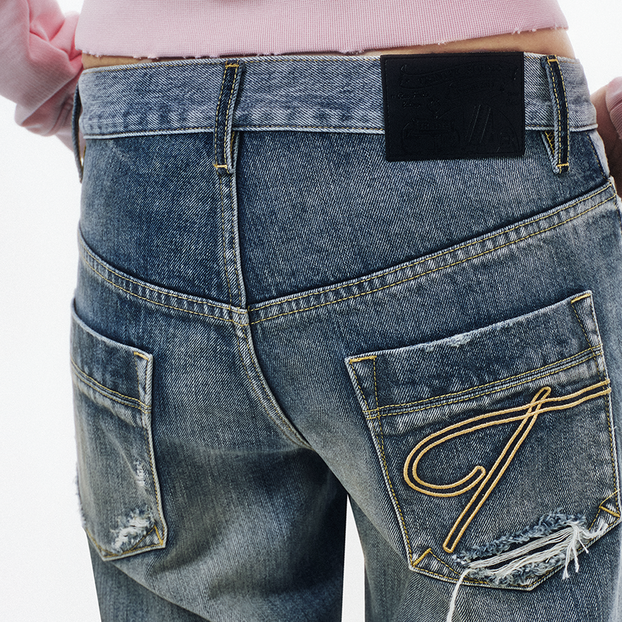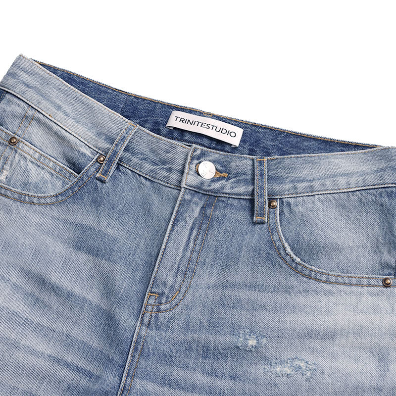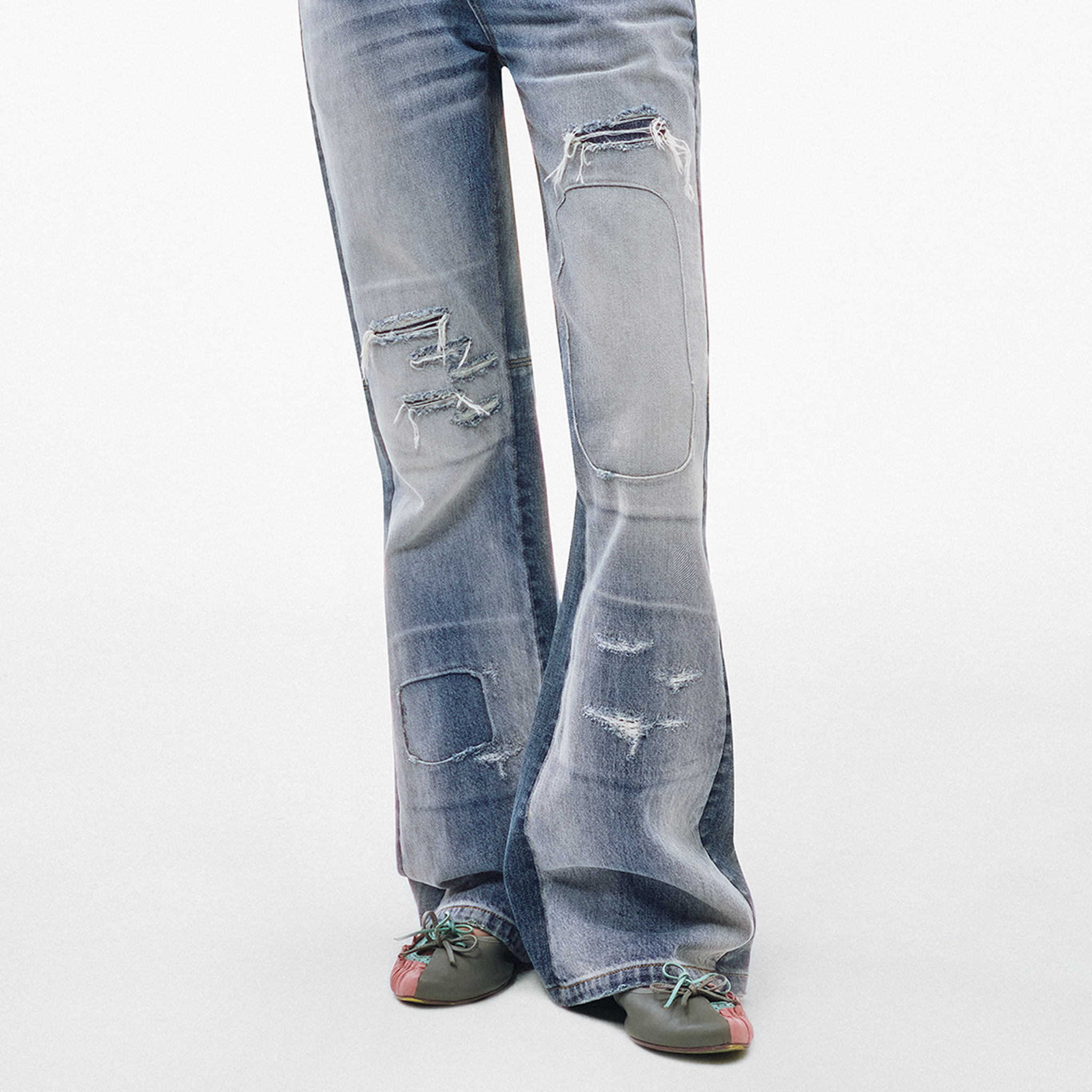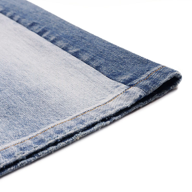 Centered on the concept of "deconstruction and reconstruction," this design merges two denim pieces with distinct wash treatments into one garment, creating a striking visual contrast. Each section is individually washed before assembly, followed by a secondary wash to harmonize color variations and creasing naturally. Patchwork and hand-sanded distressing on the front add layered texture and personalized vintage character. The mid-low rise, slightly flared silhouette elongates the legs while lending a relaxed retro feel to the overall look.