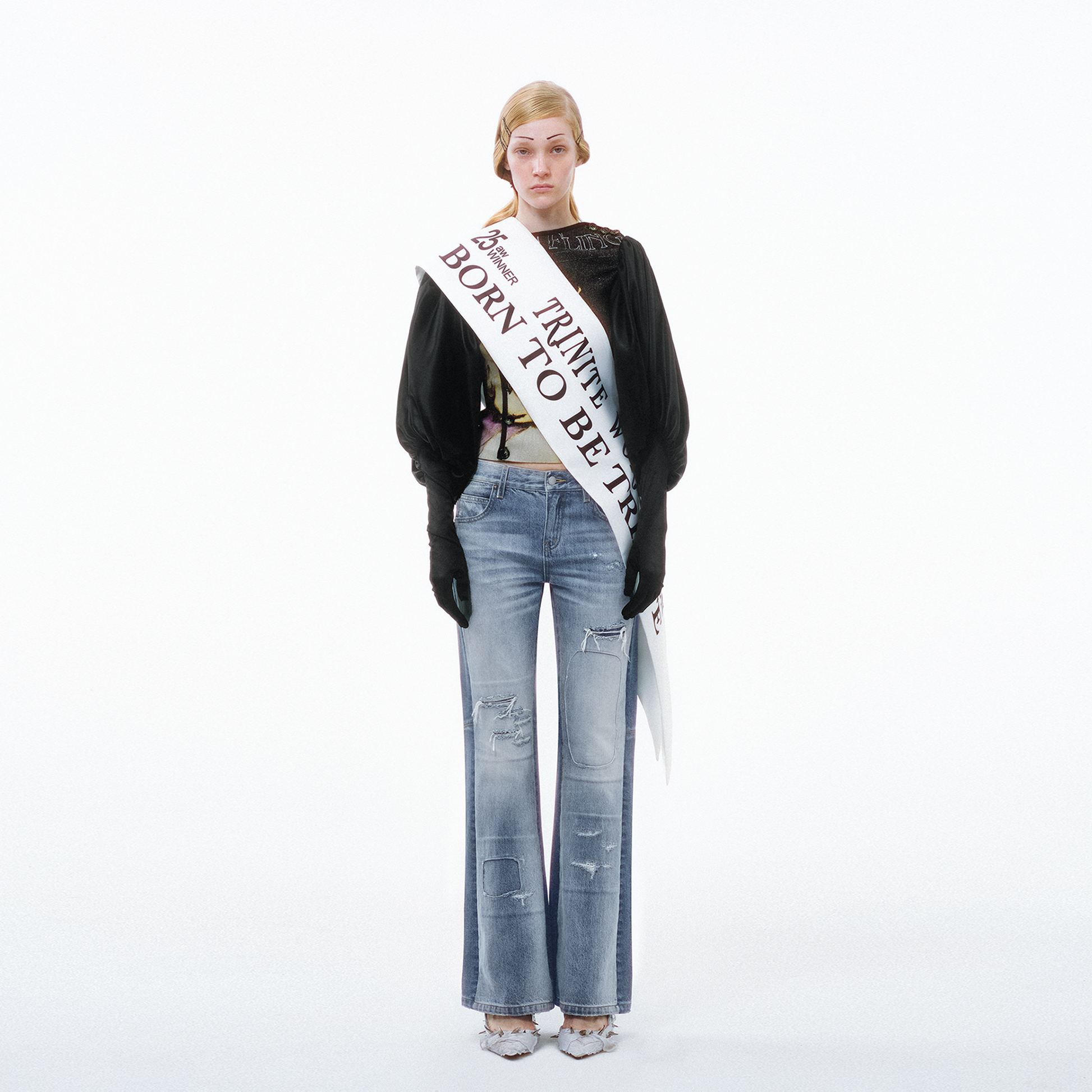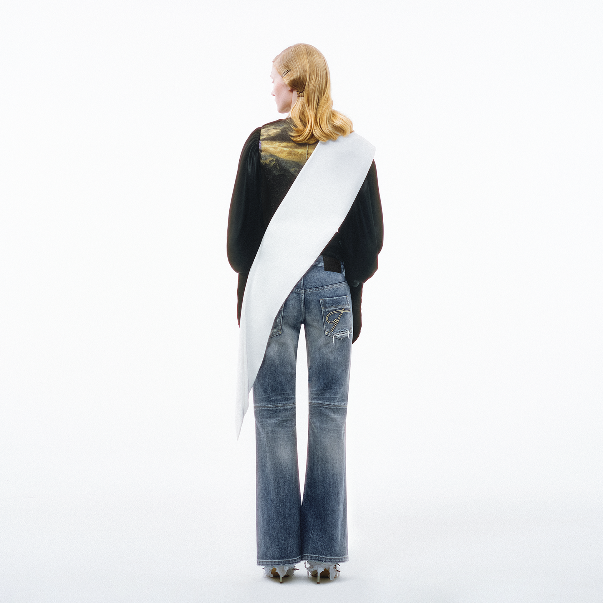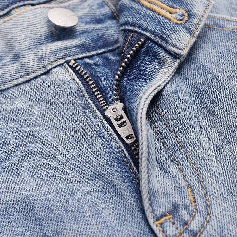 Centered on the concept of "deconstruction and reconstruction," this design merges two denim pieces with distinct wash treatments into one garment, creating a striking visual contrast. Each section is individually washed before assembly, followed by a secondary wash to harmonize color variations and creasing naturally. Patchwork and hand-sanded distressing on the front add layered texture and personalized vintage character. The mid-low rise, slightly flared silhouette elongates the legs while lending a relaxed retro feel to the overall look.