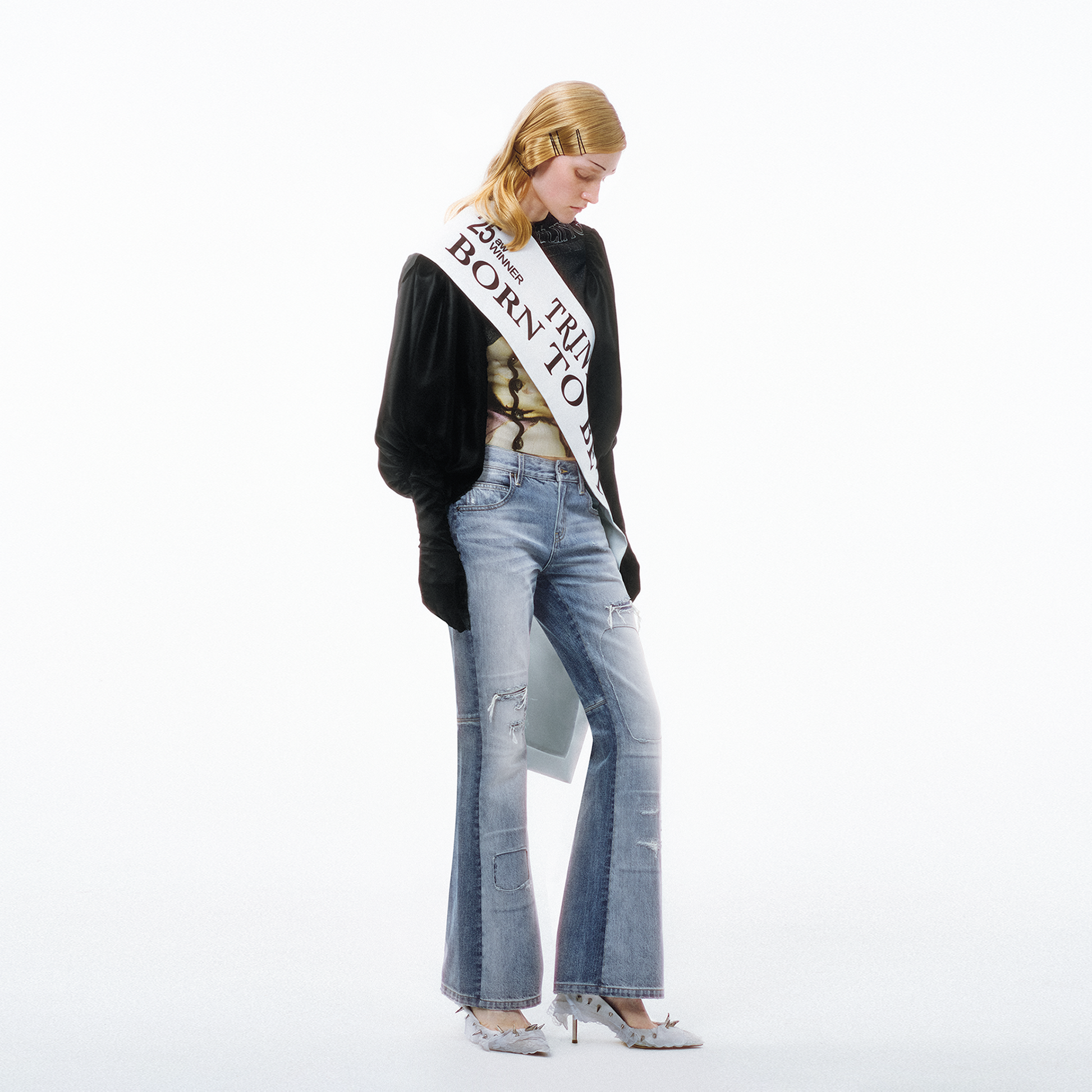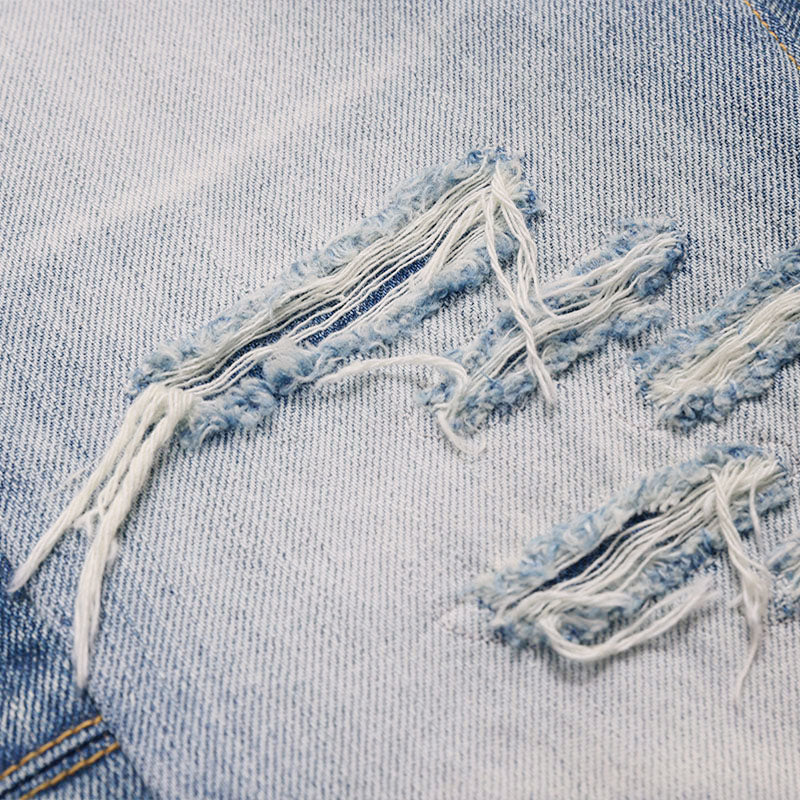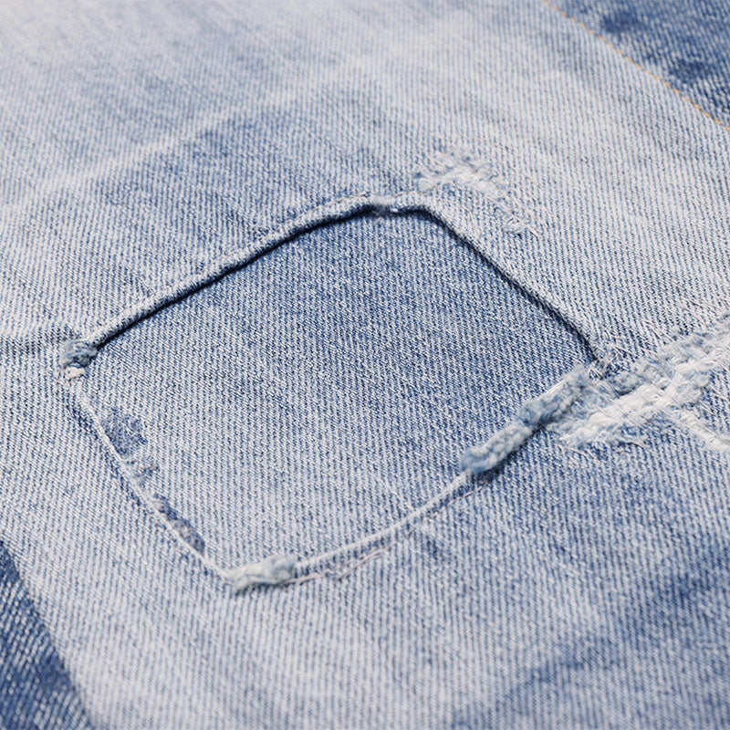• Front patchwork and distressing details