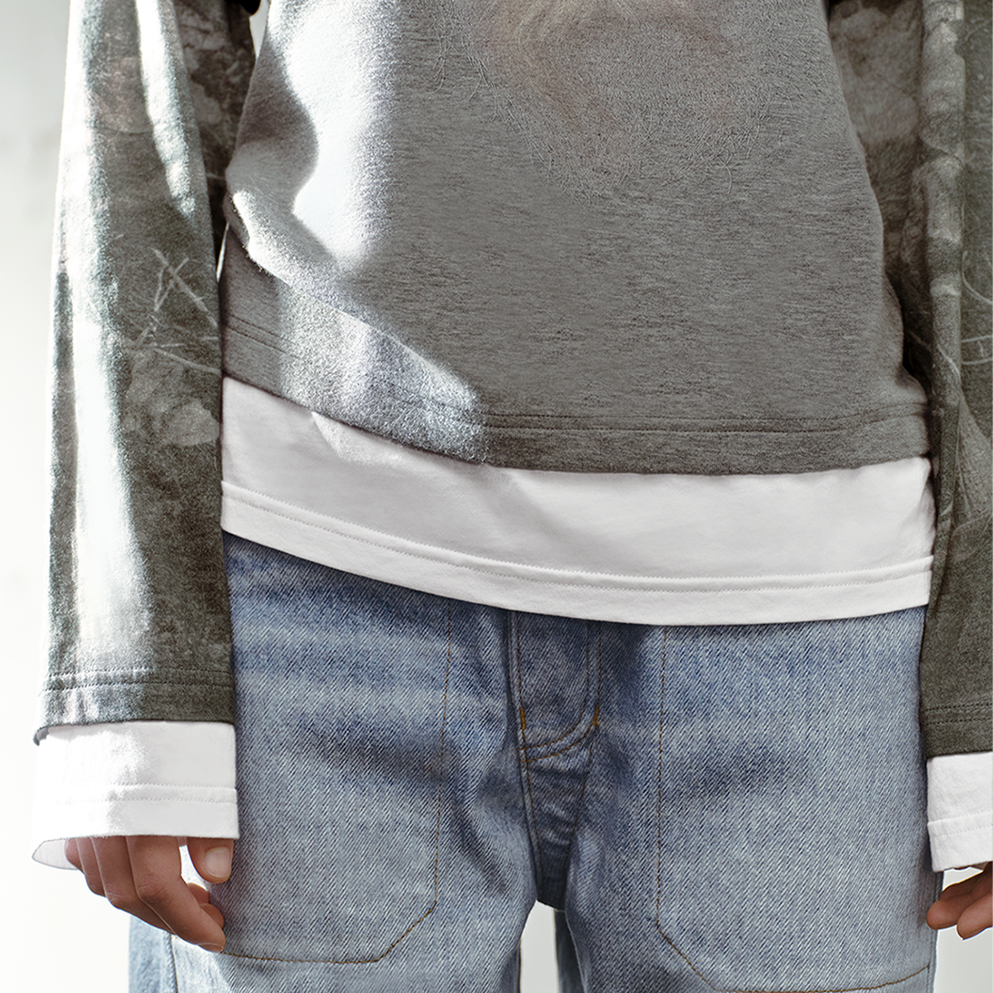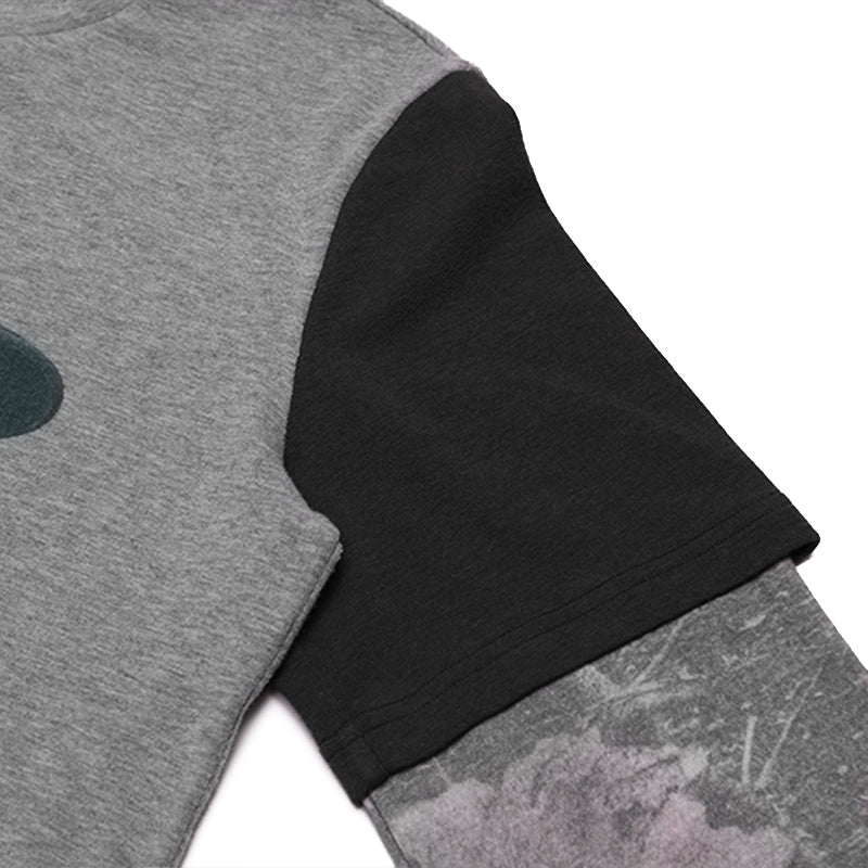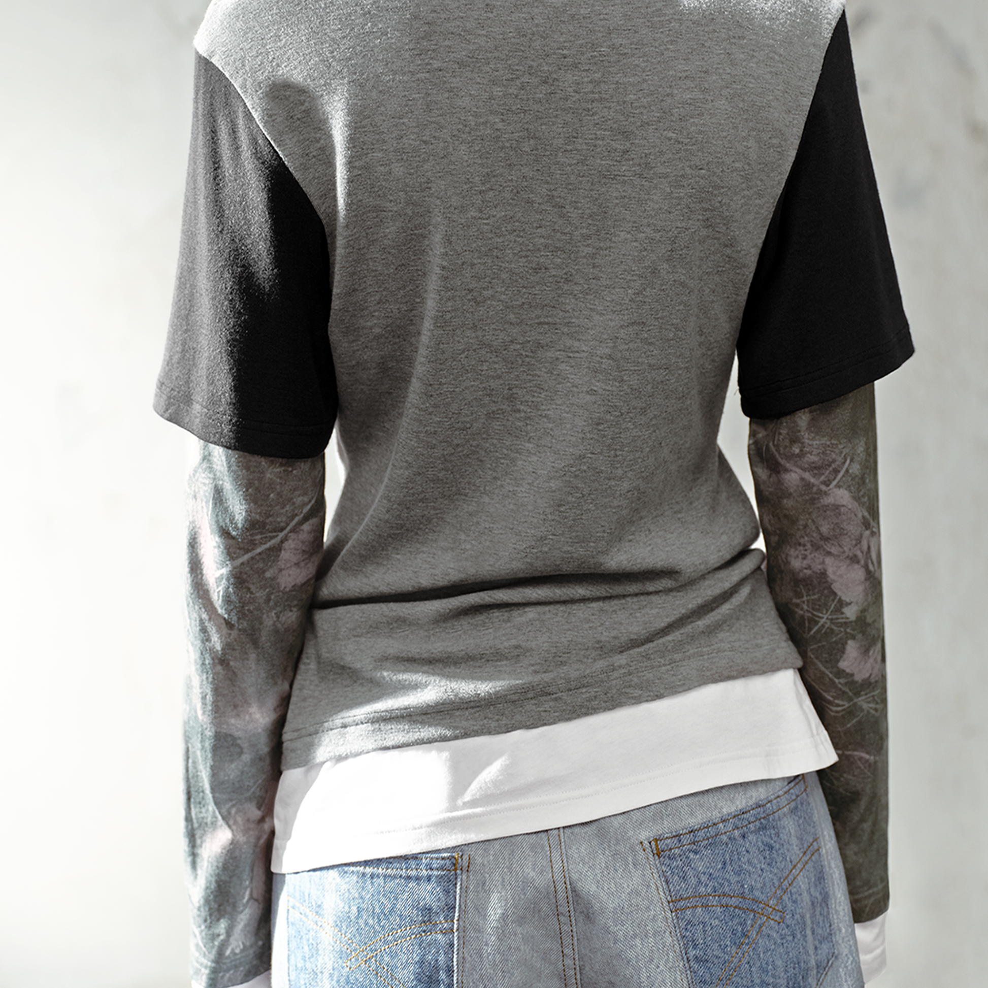 This top creates a visual layered effect, with the street-style portrait print on the chest coordinating with the camouflage print on the sleeves for a bold and dynamic look. The main fabric offers stretch, ensuring comfort and freedom of movement.