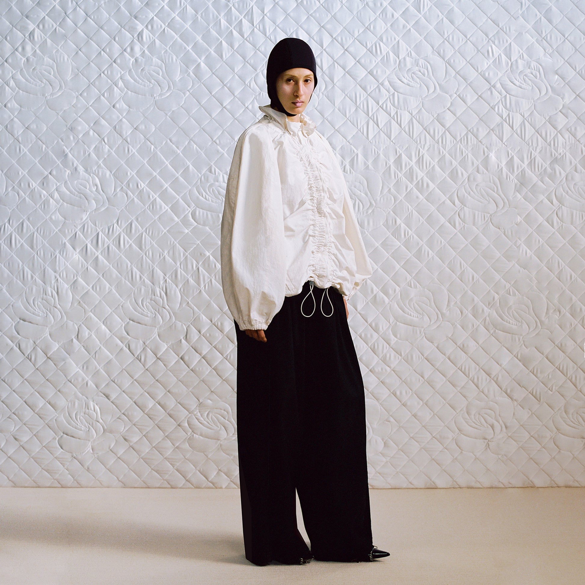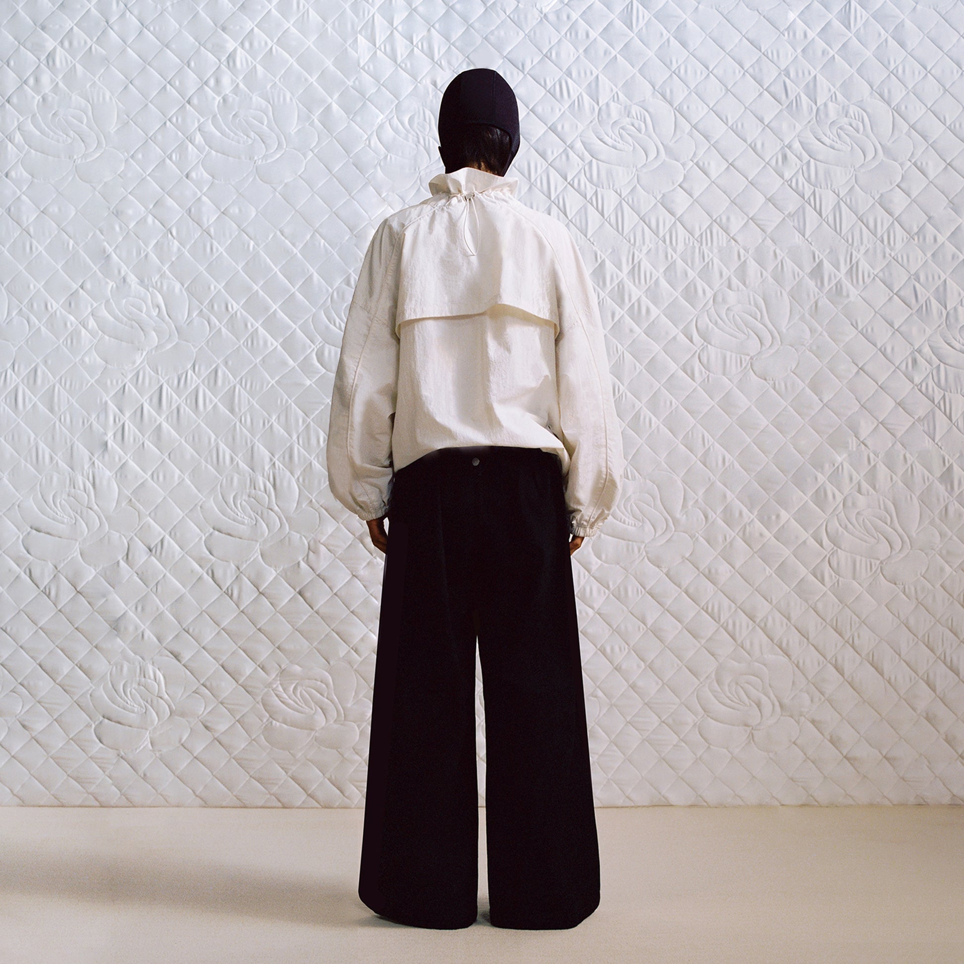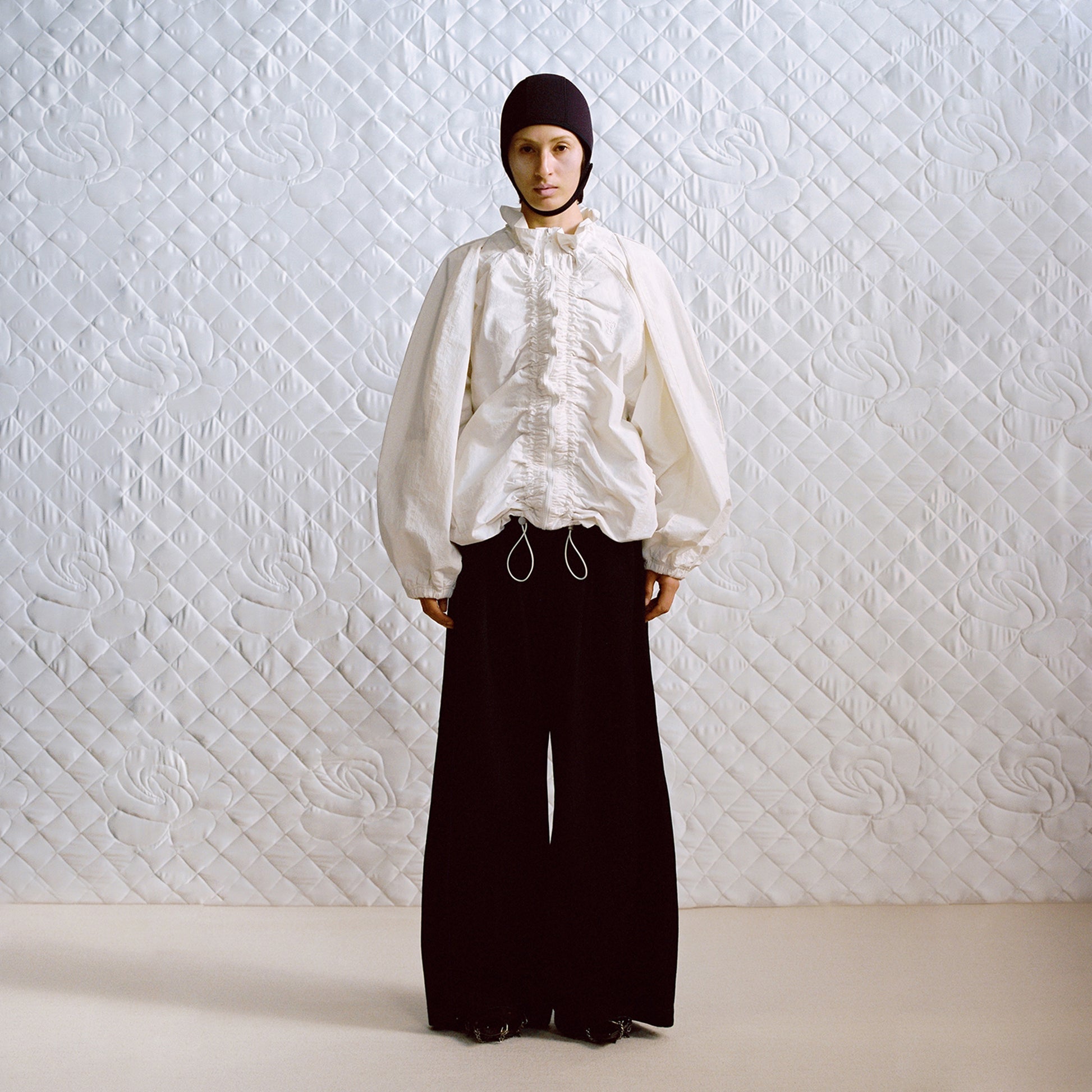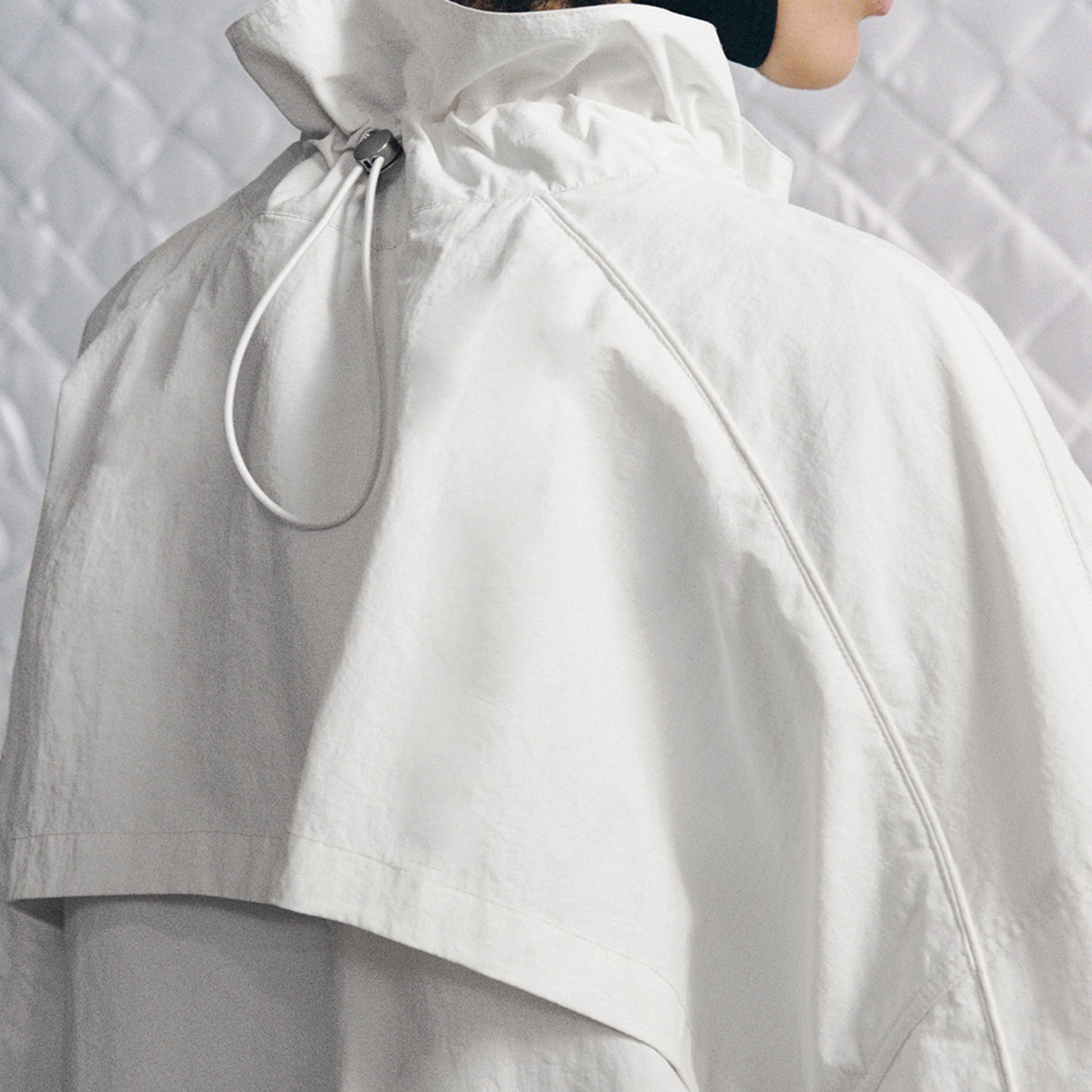 This sporty jacket reinterprets athletic aesthetics through a fashion lens, featuring sculpted sleeve construction and the brand's signature elasticized pleat details for enhanced mobility. Perfect for everyday wear or casual occasions, the clean white exterior radiates modern energy while striking an ideal balance between functionality and distinctive style—making it an essential wardrobe staple.